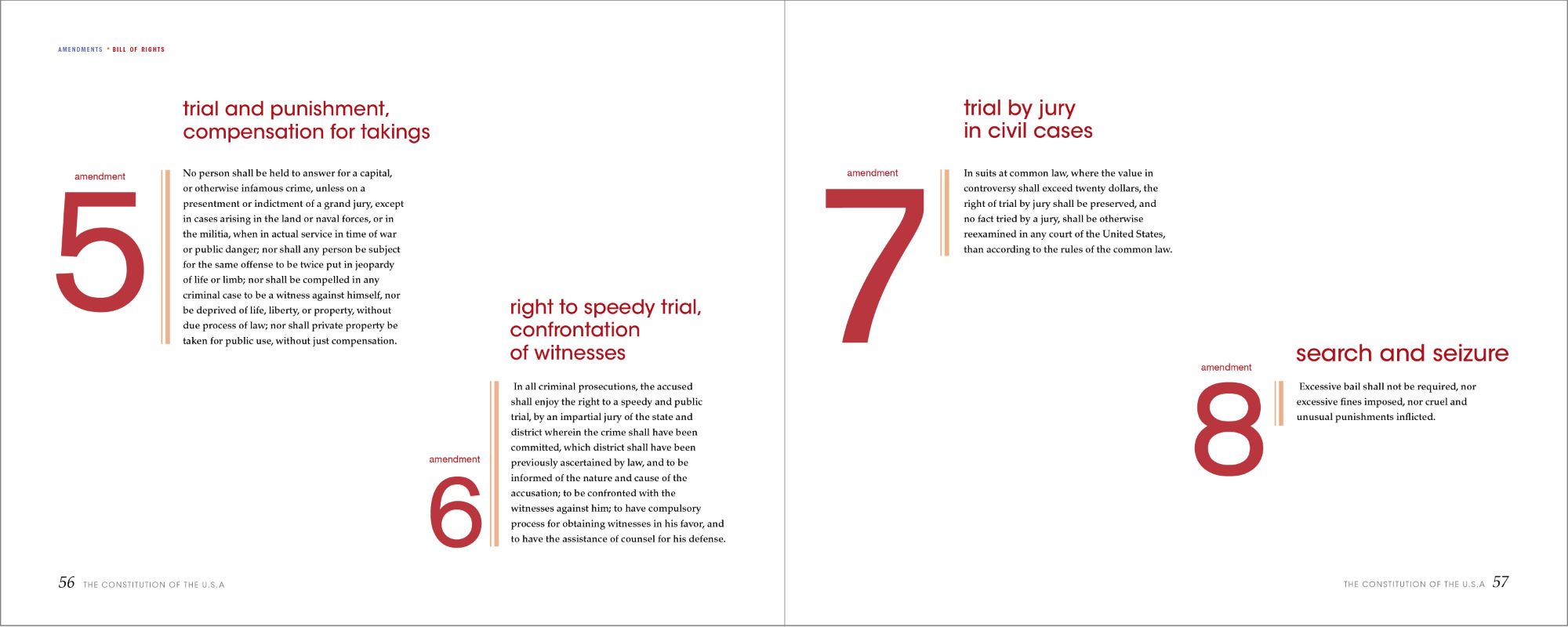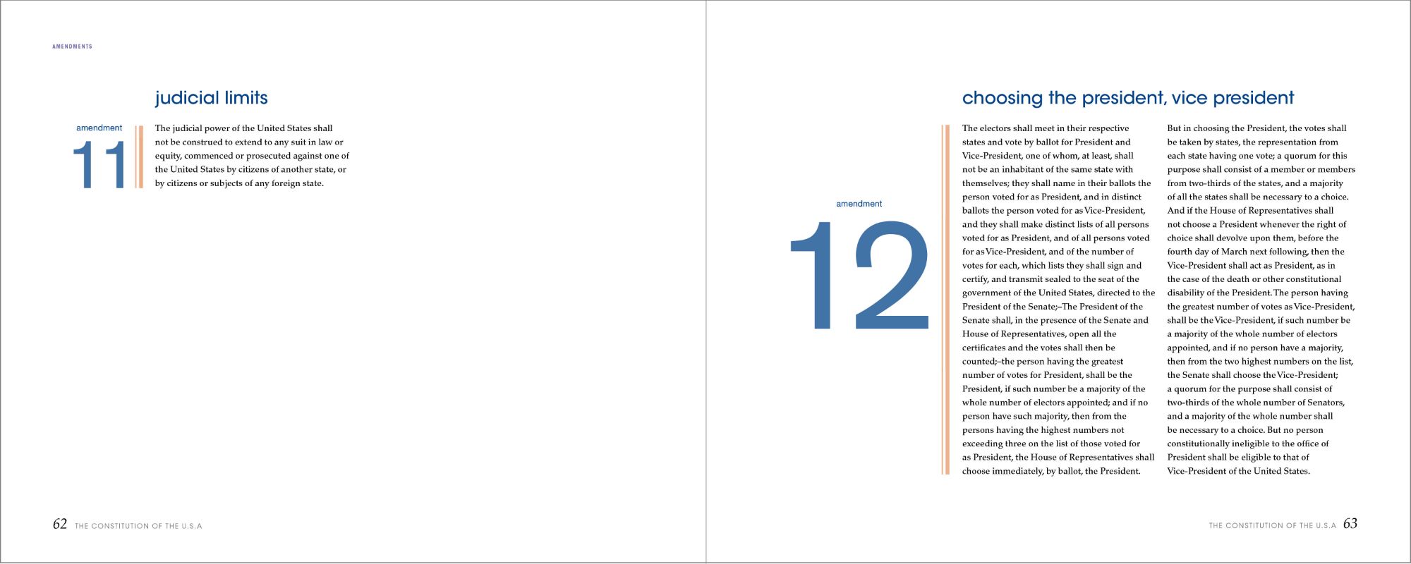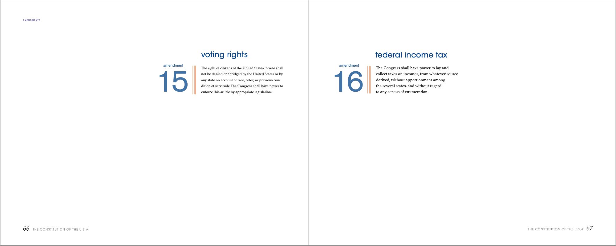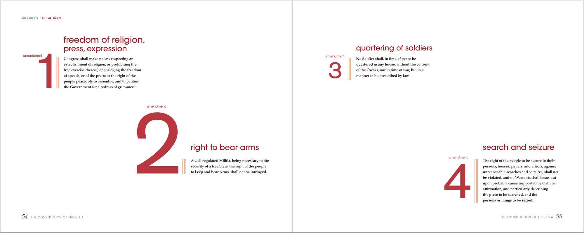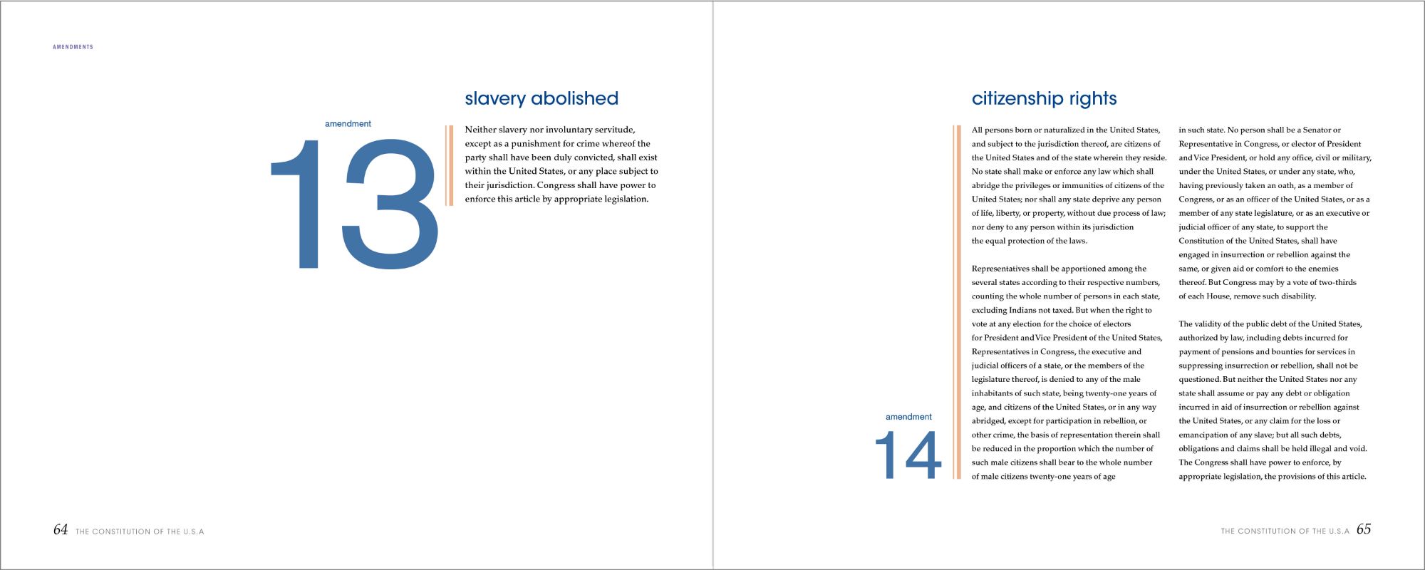 After deciding on the composition for the sections, I applied the same technique to the amendments, but with slight differences. I changed the font of the numbers from serif to sans-serif, and the dashed rule to a linear one to indicate this as a different part of the book. I treated the Bill of Rights differently to let the reader know that the first ten amendments are a separate document. I changed the color from blue to red and the pacing of the book. As for the remaining amendments, they return back to the original color scheme as seen previously, while still incorporating the new changes in elements and fonts.