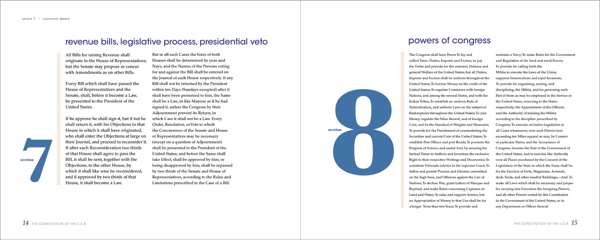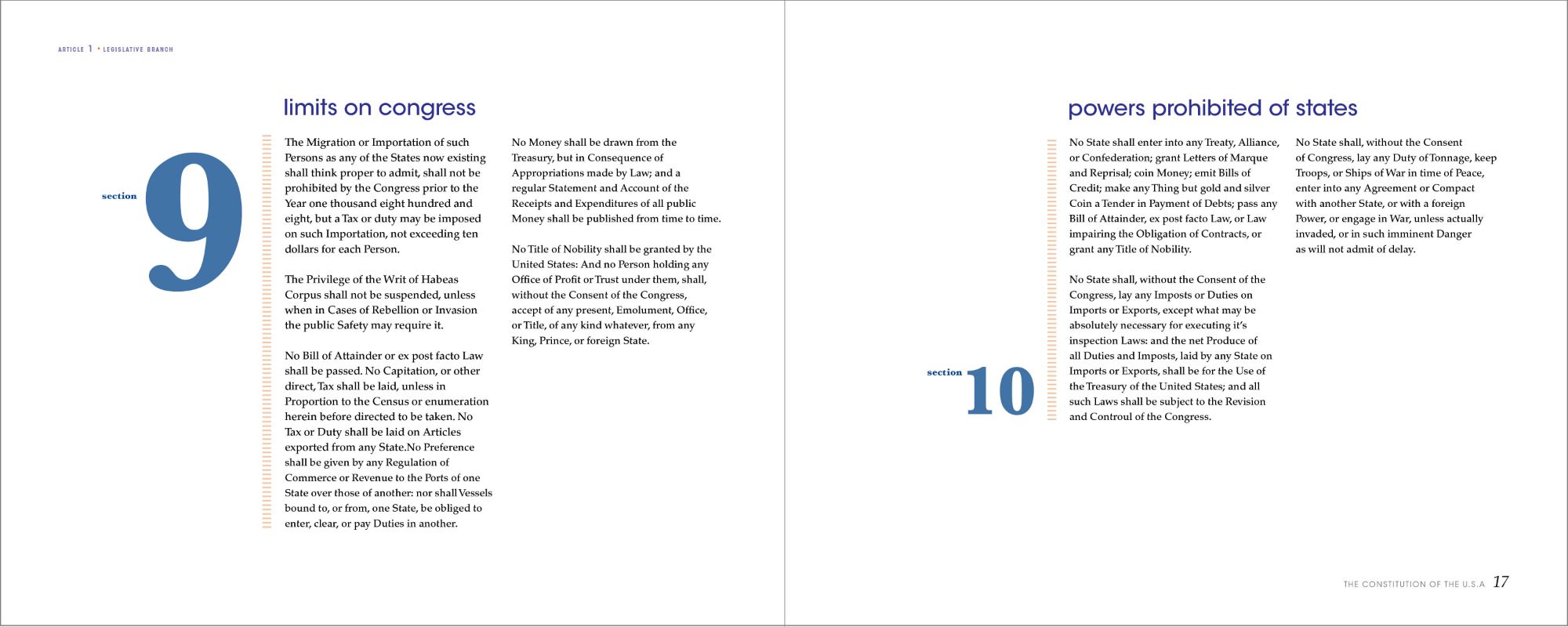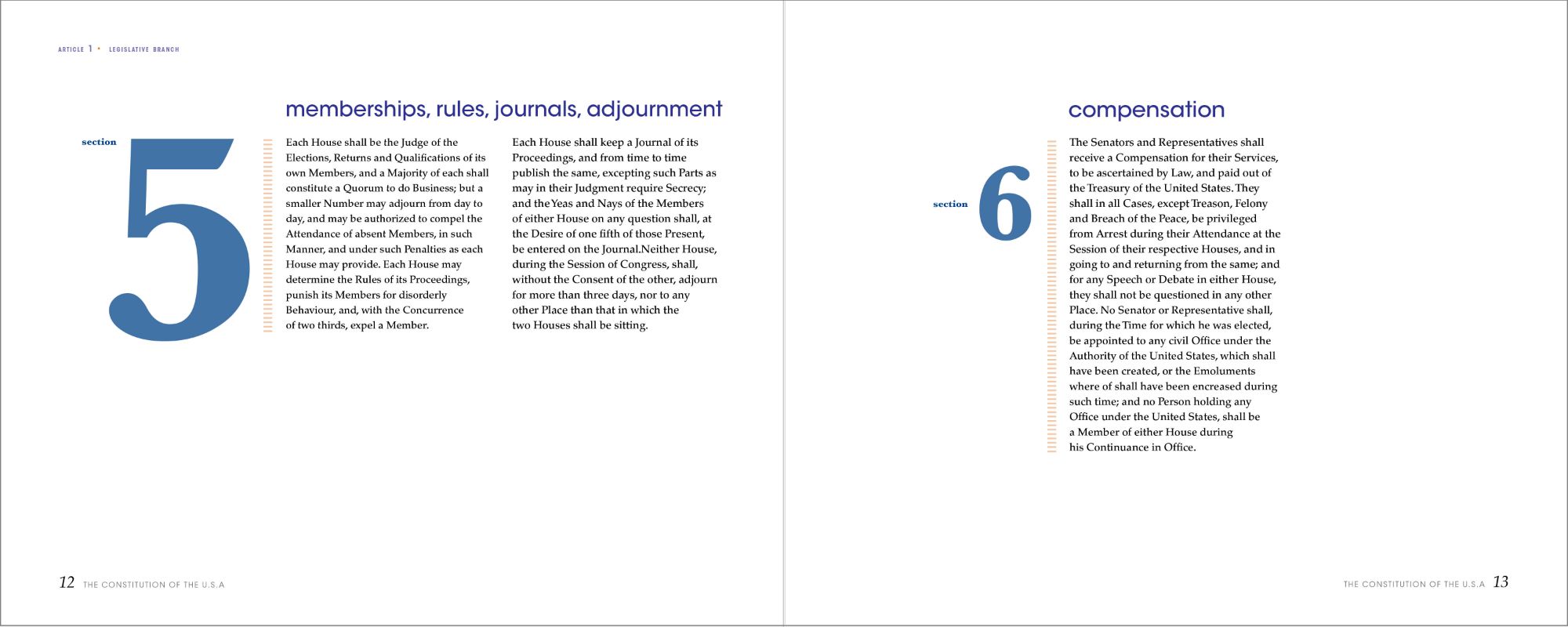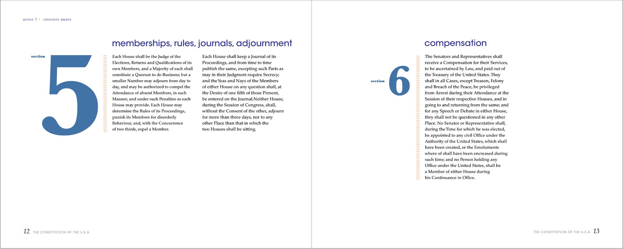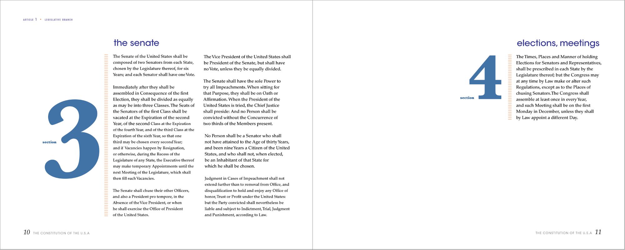 After deciding on the composition for the sections, I applied the same technique to the amendments, but with slight differences. I changed the font of the numbers from serif to sans-serif, and the dashed rule to a linear one to indicate this as a different part of the book. I treated the Bill of Rights differently to let the reader know that the first ten amendments are a separate document. I changed the color from blue to red and the pacing of the book. As for the remaining amendments, they return back to the original color scheme as seen previously, while still incorporating the new changes in elements and fonts.