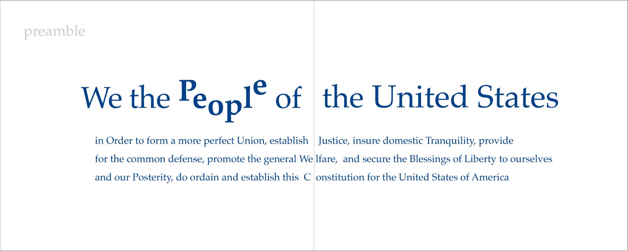 The majority of this project is done in Avante Garde- a sans-serif font, with subtle uses of serif font- Palatino, for sections such as the preamble. I alternated the fonts to communicate that the reader is now in a different section of the book. I started off with some word play on 'people' to emphasize to the reader that they are a part of this Constitution. It immediately includes the reader by directly engaging them with the document.