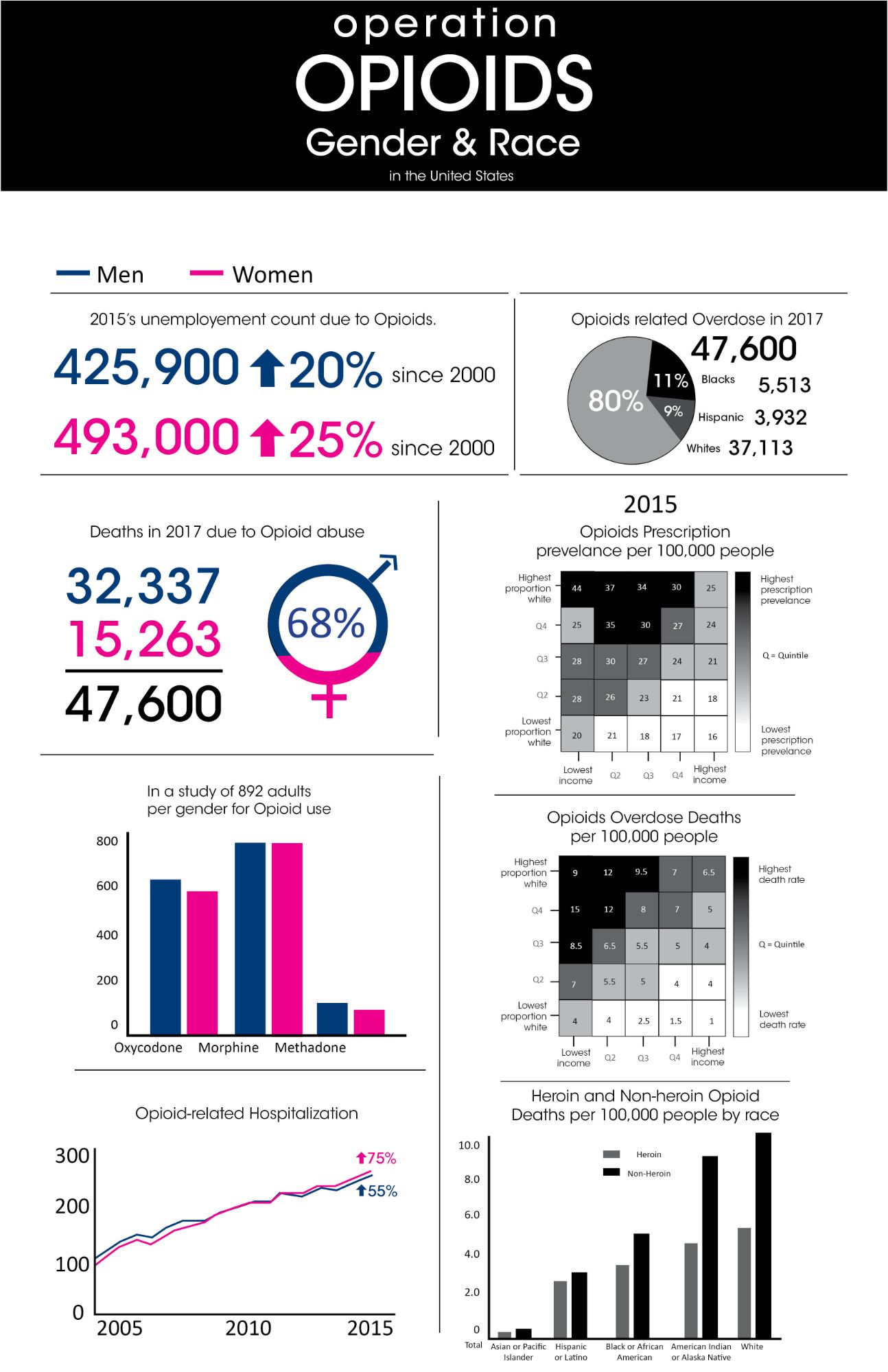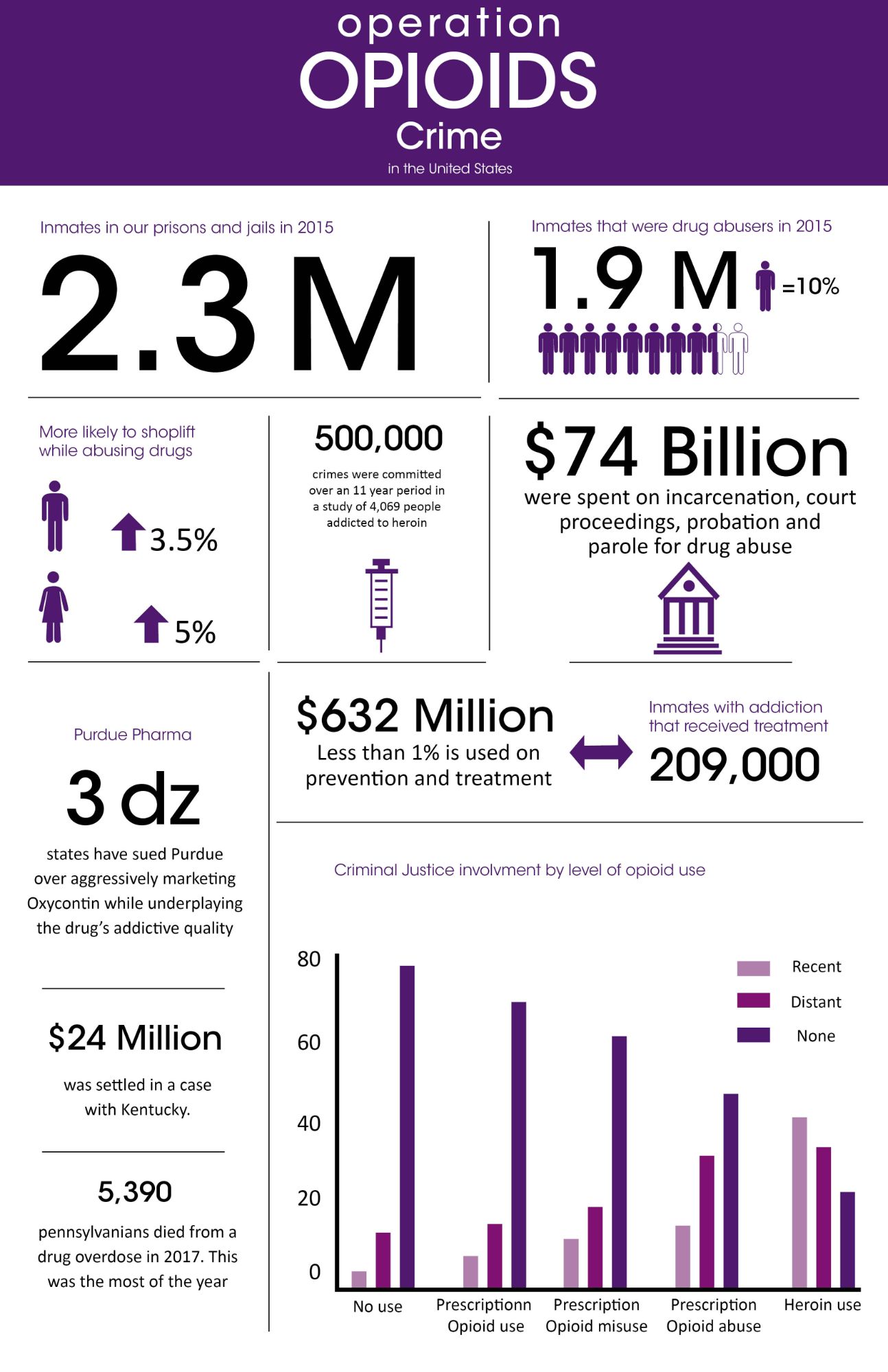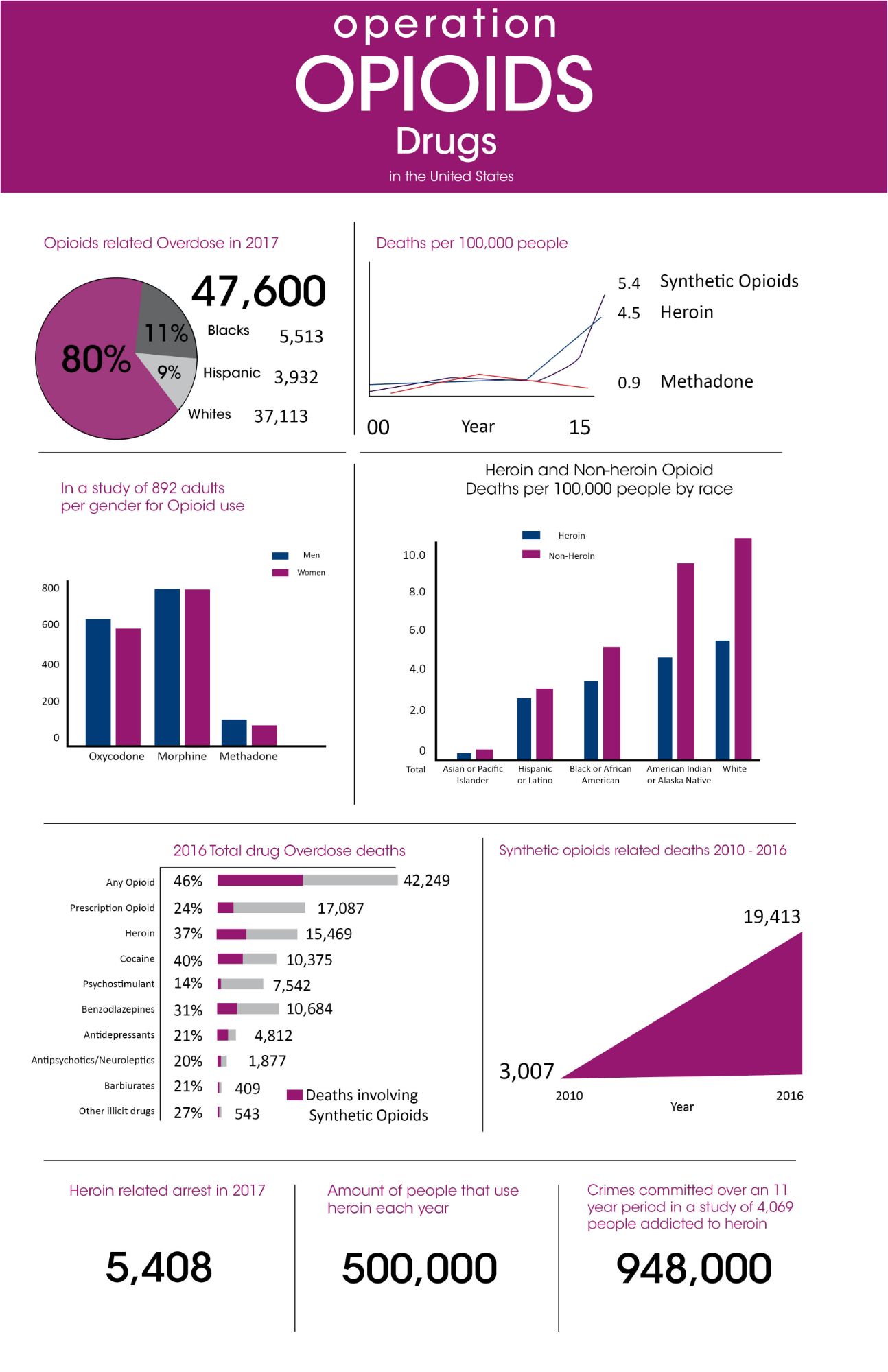Research was done in several different topics of the Opioid Epidemic. Crime, deaths, employment, homelessness, drug types, gender, and race. I provided ten sections of information per infographic. All sections differ in sizes to keep the composition flowing. Each infographic starts with an overall statistic and is then broken down further. To keep the infographic visually interesting, I added elements such as pie charts, bar graphs, line graphs, and percentages. Each topic has its own dedicated color. They appear on the header, titles of the section, elements, and in any illustration made for the infographic.