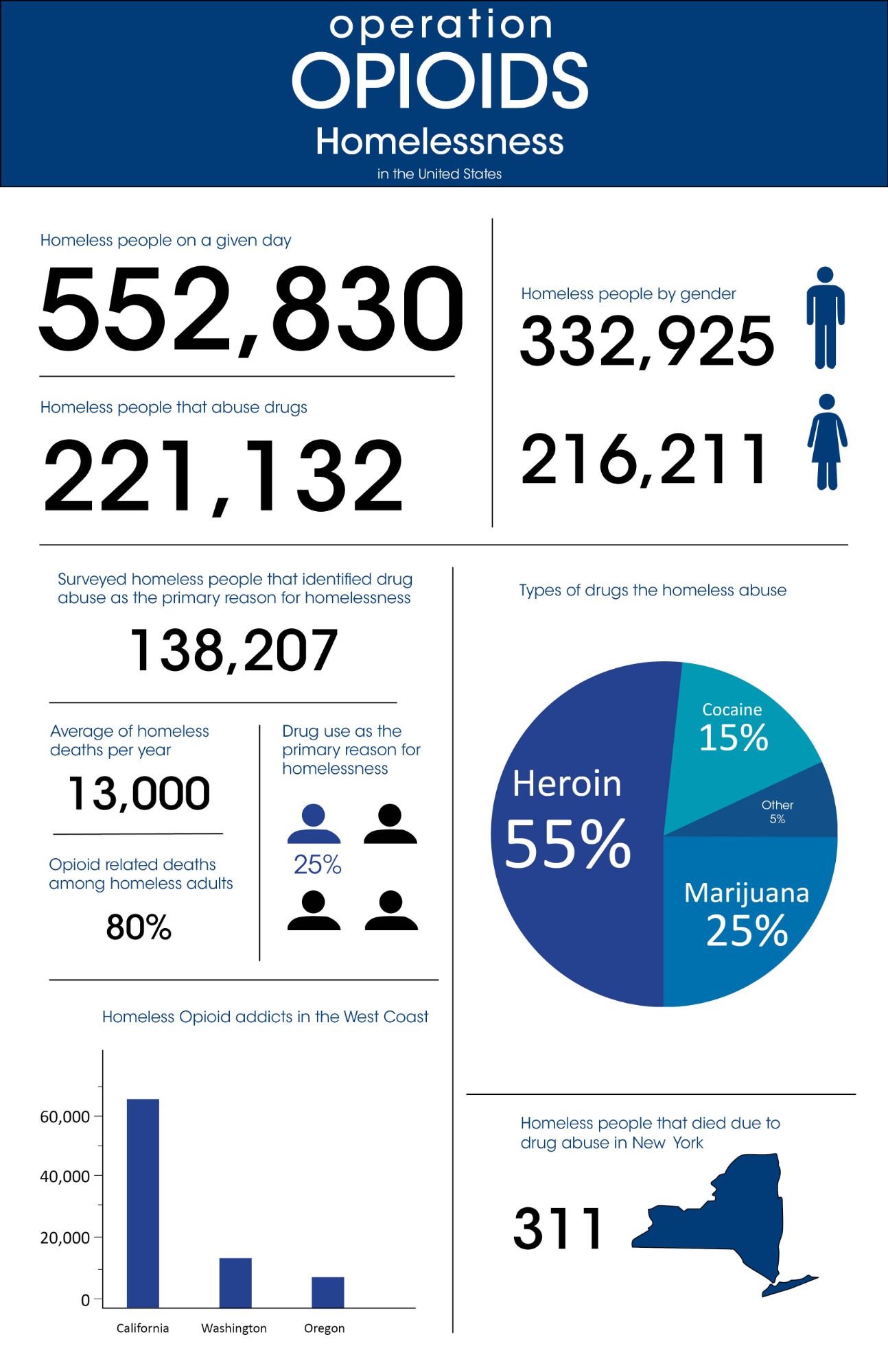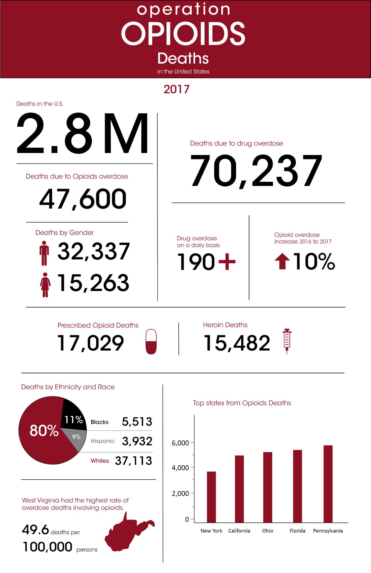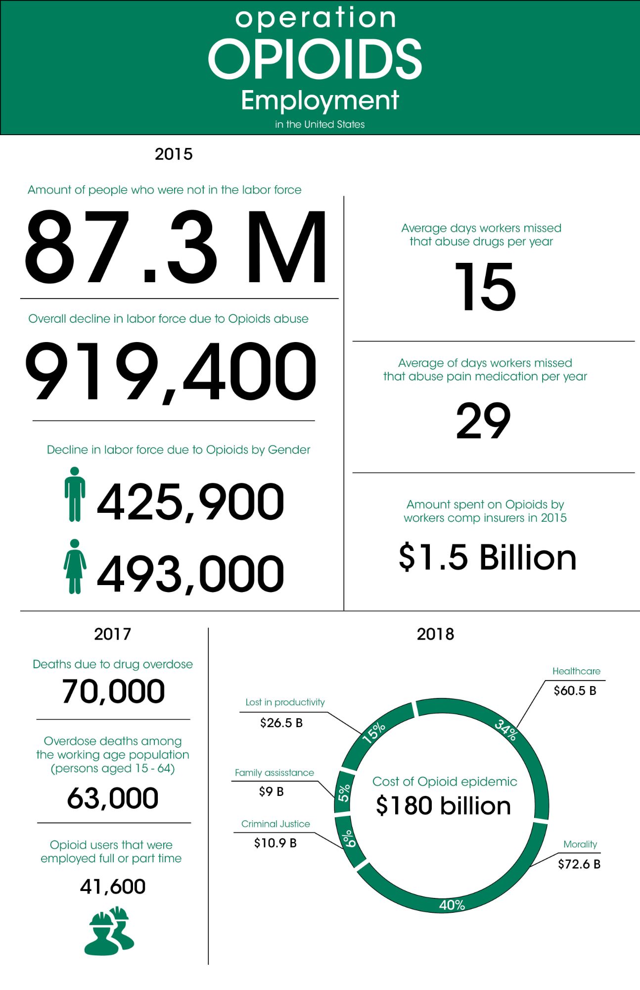 Research was done in several different topics of the Opioid Epidemic. Crime, deaths, employment, homelessness, drug types, gender, and race. I provided ten sections of information per infographic. All sections differ in sizes to keep the composition flowing. Each infographic starts with an overall statistic and is then broken down further. To keep the infographic visually interesting, I added elements such as pie charts, bar graphs, line graphs, and percentages. Each topic has its own dedicated color. They appear on the header, titles of the section, elements, and in any illustration made for the infographic.