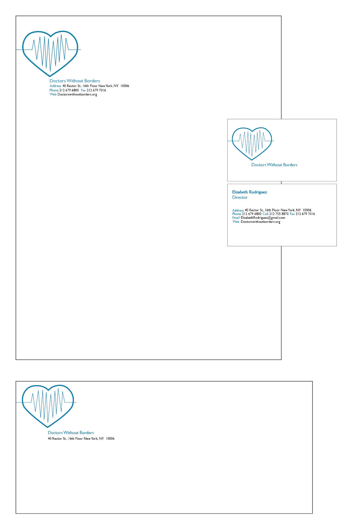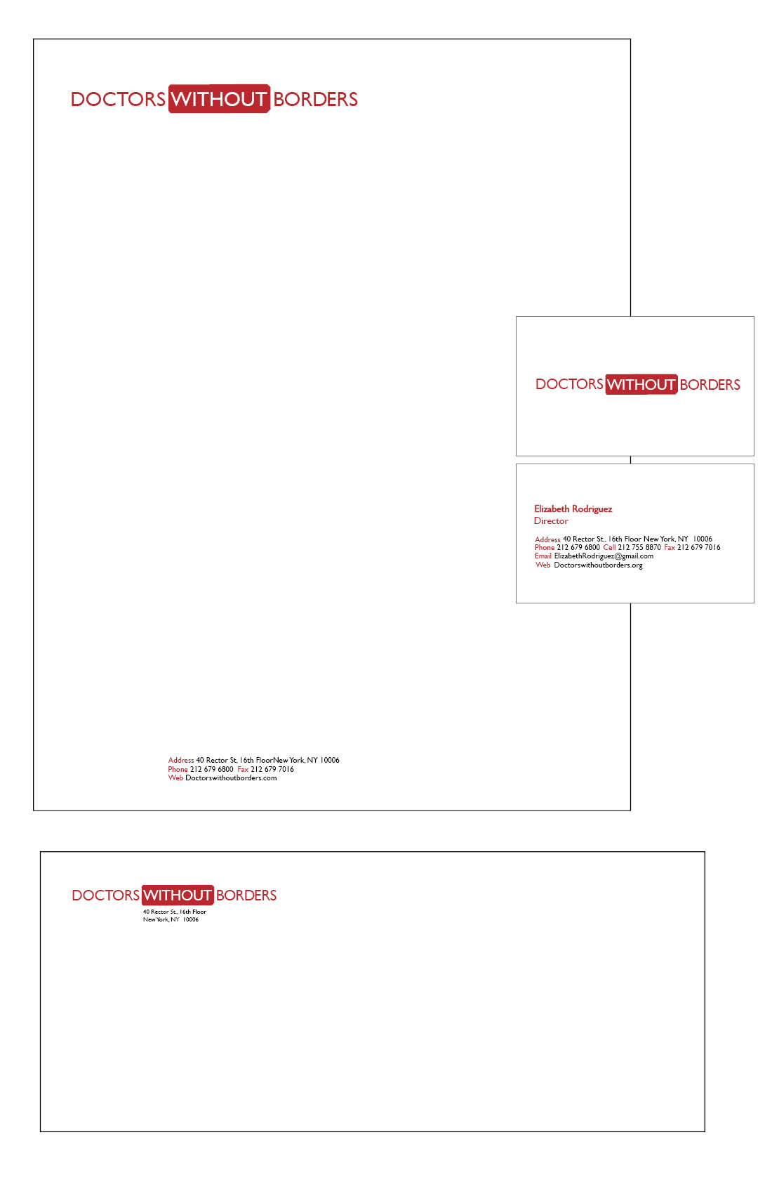 Rebranding the nonprofit organization ‘Doctors Without Borders’ with three logos. This includes letterheads, envelopes, and business cards.
